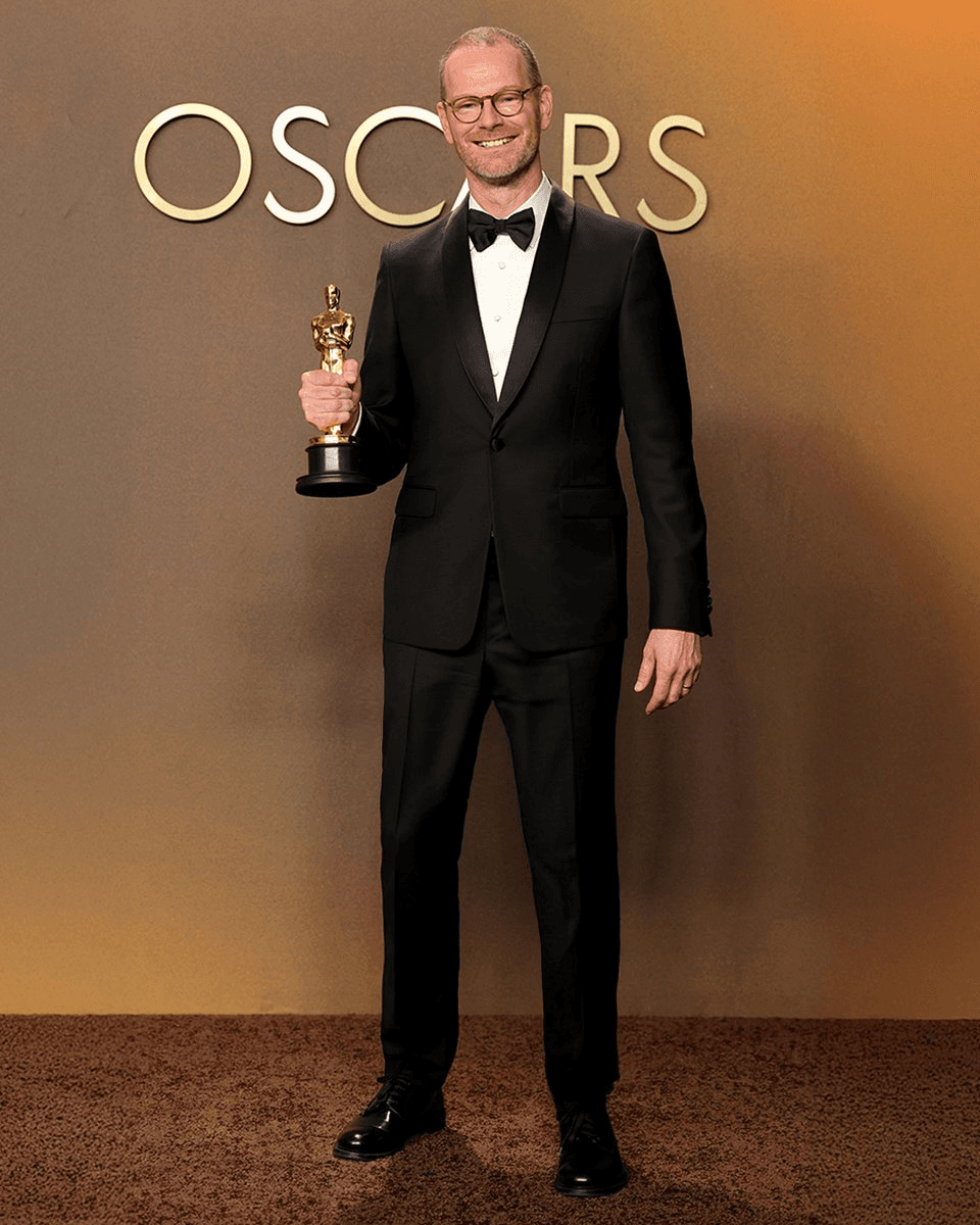 At the 98th Academy Awards, Prada dressed multiple attendees including Best International Feature Film winner Joachim Trier and brand ambassador Damson Idris. **Key Looks:** - **Joachim Trier** (winner for *Sentimental Value*): Black mohair tuxedo with white poplin shirt and black silk bowtie - **Damson Idris**: Navy double satin coat with shearling collar, black mohair gilet, and grey pinstriped trousers The brand also outfitted Felicity Jones in a pastel yellow satin gown with crystal embellishments and Ethan Hawke (Best Actor nominee) in a black silk tuxedo. Prada continues its presence at major awards ceremonies, having also dressed talent at the recent Actor Awards including Michelle Williams, Sam Rockwell, and Timoth茅e Chalamet.