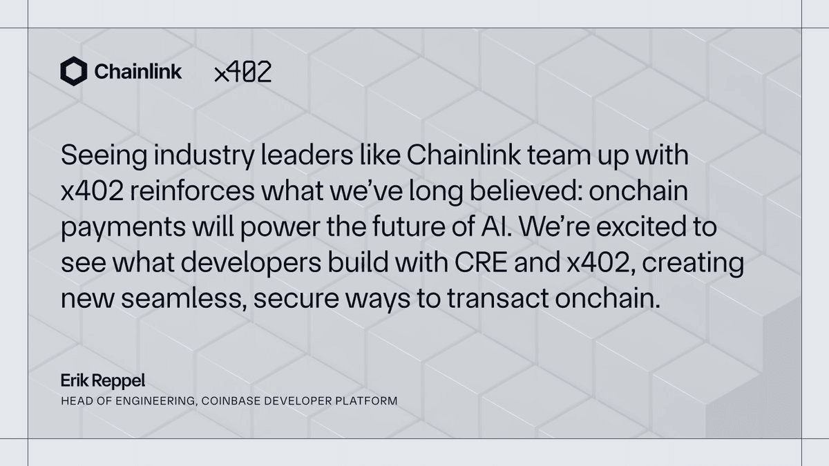 AI agents can now autonomously pay for Chainlink Runtime Environment (CRE) workflows through Coinbase's x402 integration. **Key Development:** - AI agents execute onchain transactions independently - Integration enables payment for CRE workflows without human intervention - Creates foundation for AI-powered onchain economy **Technical Integration:** The x402 protocol from Coinbase allows AI agents to handle payments directly within the Chainlink ecosystem, removing manual payment barriers. **Market Impact:** This capability builds on recent progress where AI agents demonstrated cross-chain USDC transactions at near-zero cost, opening new monetization models for internet-based services.