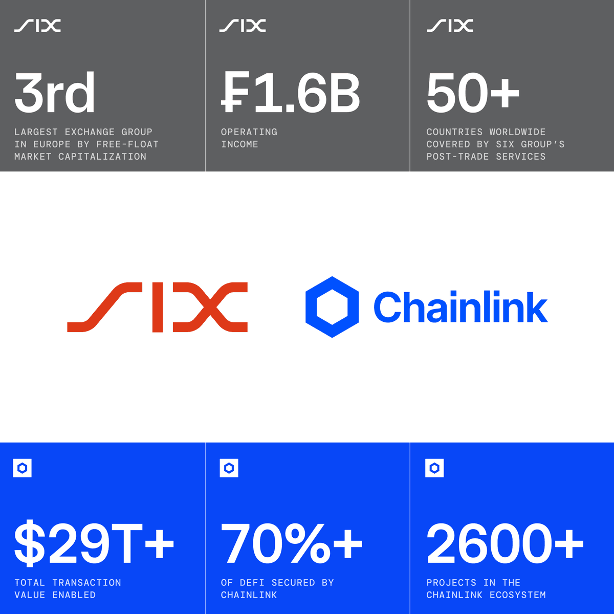 SIX Group, operator of Swiss and Spanish national exchanges, has adopted Chainlink to bring premium European equities data onchain. **Key Details:** - Partnership unlocks tokenization potential for over €2 trillion in European equities - SIX Group joins organizations using Chainlink DataLink for institutional-grade data - First time SIX's data will be available onchain The collaboration marks a significant step in bridging traditional finance with blockchain infrastructure, enabling new possibilities for tokenized securities in European markets. [Full details](https://www.six-group.com/en/newsroom/media-releases/2026/20260416-six-chainlink.html)