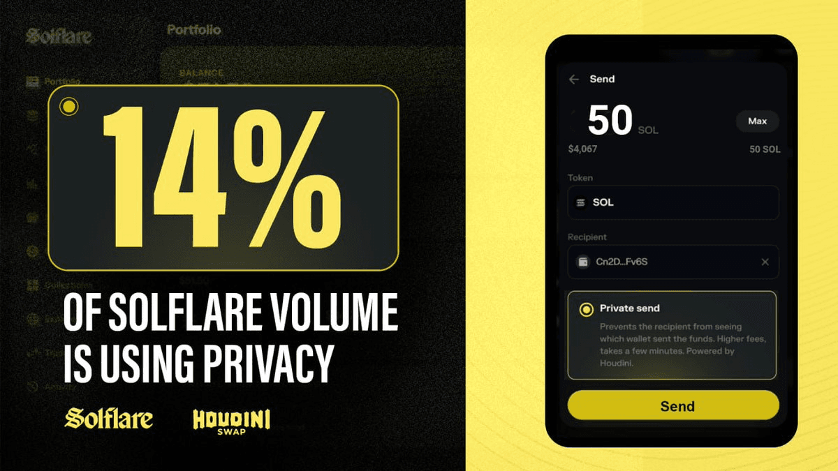 Houdini Swap has processed over $1 billion in private Solana volume across 750,000+ transactions. The privacy tool is now integrated directly into Solflare wallet's send flow, making private transactions accessible without extra steps. **Key metrics:** - $1B+ in private SOL volume - 750k+ private transactions - Native integration in Solflare wallet The service provides compliant privacy infrastructure for Solana users, including private swaps, sending, payments, and wallet funding. Houdini Swap positions itself as the primary privacy solution currently operating on Solana. Solflare became the first major Solana wallet to ship native private sending, marking a shift in how privacy features are delivered to users - built into core wallet functionality rather than requiring separate tools or workflows.