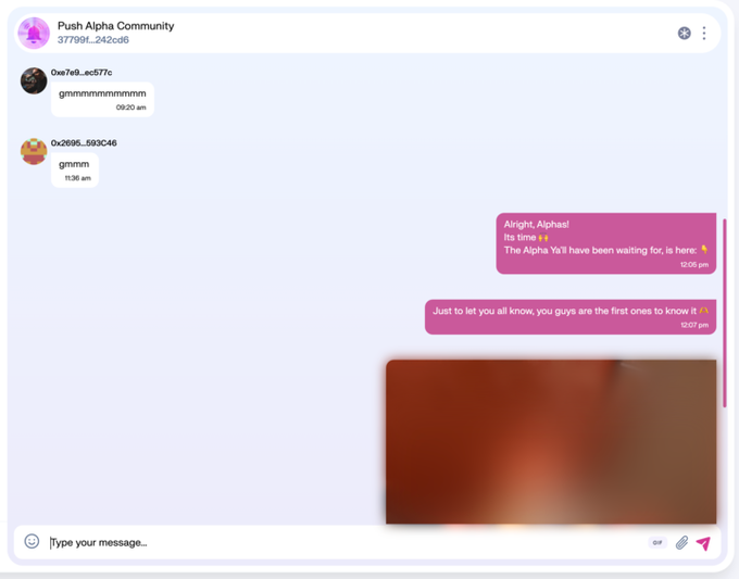 To join the gated group chat and access the Alpha: 1. Ensure you hold a Push Alpha Access NFT 2. Visit: https://app.push.org/chat/chatid:37799f9cb3ffd83eff4d2dc18913a3d9607f9c787a4374a7b3259bda28242cd6