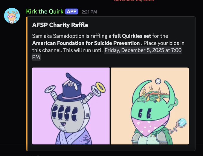 The Quirkies Discord is hosting a charity auction for the American Foundation for Suicide Prevention (AFSP). Head of Web @SamAdoption is running the week-long event.