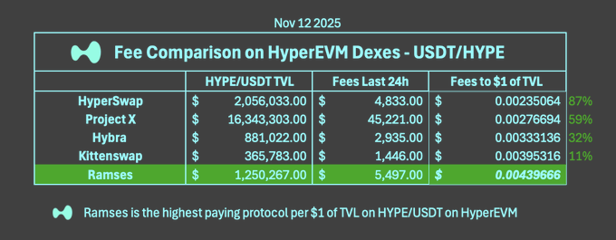 Ramses outperforms competitors by 179% in fee generation per dollar of TVL on HyperEVM through two key innovations: