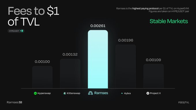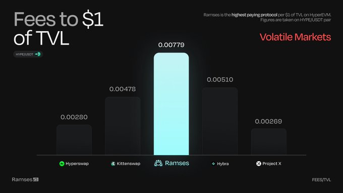 Ramses is the most efficient exchange on HyperEVM, up to 87% more fees per $1 of TVL than competitors. How? We are the only DEX with dynamic fees. 😼 This will only improve as we scale with emissions and add more aggregator integrations. ☑️ Learn more 👇