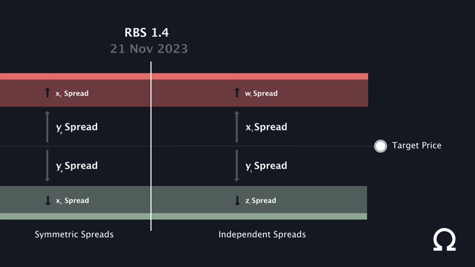↕️ RBS 1.4 is now live, which includes incentivized contract calls to earn $OHM. This infrastructure update introduces asymmetric spreads to give the Range Bound Stability system flexibility in adjusting the spread of cushions and walls independently. 👀 Stay tuned for