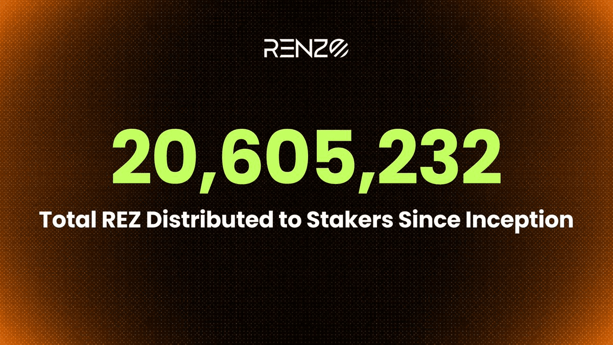 Renzo has distributed a cumulative total of **20,605,232.6 REZ** to REZ stakers since the program's inception. **Key Protocol Metrics:** - Purchased 206,052,326 REZ from the open market using protocol revenues - Burned 185,447,093 REZ, reducing total supply by 1.85% - Additional token burns planned for the future The distribution represents ongoing rewards for participants in Renzo's staking program, funded through the protocol's revenue-generating activities. The token buyback and burn mechanism aims to manage REZ supply while rewarding long-term holders.