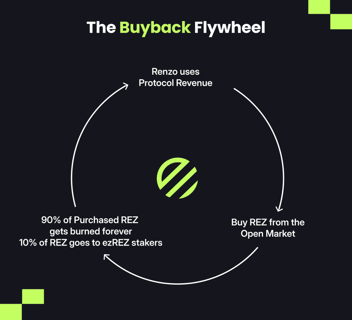 Renzo Protocol has introduced a **Buyback and Burn Flywheel** program for its REZ token, with real-time tracking available through a [Dune Analytics dashboard](https://dune.com/renzo_team/renzo-protocol#rez-buyback-program). **Key Details:** - The program aims to reduce REZ token supply through systematic buybacks and burns - Token holders can monitor the program's progress in real-time - Renzo emphasizes alignment between protocol success and token holder outcomes The initiative represents Renzo's commitment to its community and REZ holders, creating a transparent mechanism where protocol growth directly benefits token holders through supply reduction.