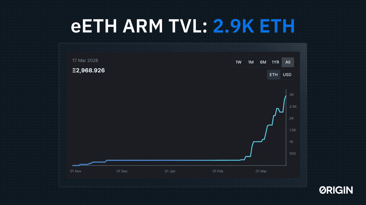 The EtherFi eETH Automated Risk Manager (ARM) has reached an all-time high in deposits while delivering strong returns. **Key Performance Metrics:** - Daily APY: 8.9% - 30-day average APY: 4.5% **How the ARM Works:** The ARM maintains the eETH peg to ETH through an arbitrage mechanism. When eETH trades below 1 ETH on automated market makers (AMMs), the ARM purchases it at a discount, then redeems it through EtherFi's withdrawal queue at full value, capturing the spread as profit. This automated system benefits both depositors through yield generation and the broader eETH ecosystem by providing price stability. [Explore the eETH ARM](https://app.originprotocol.com/#/arm/1:ARM-WETH-eETH)
