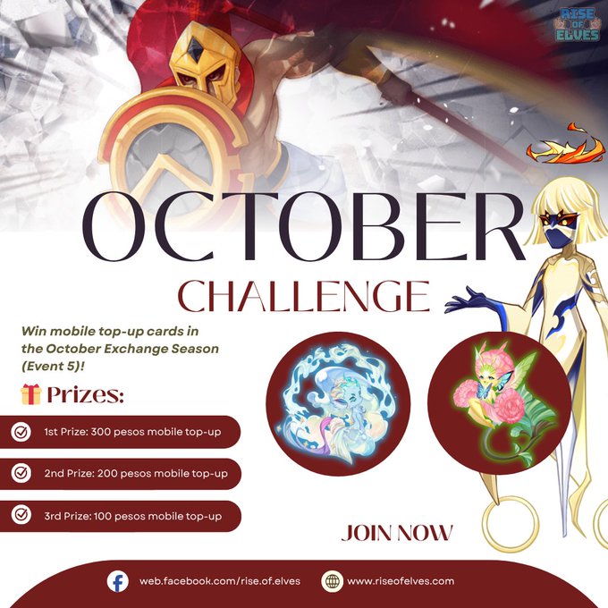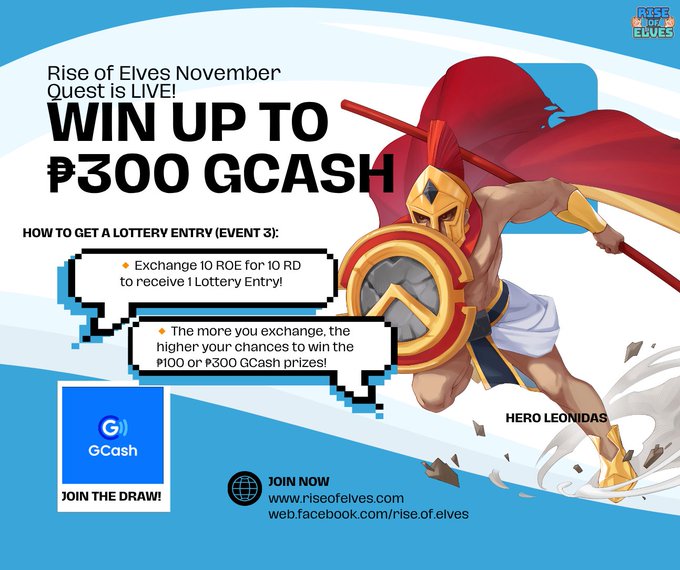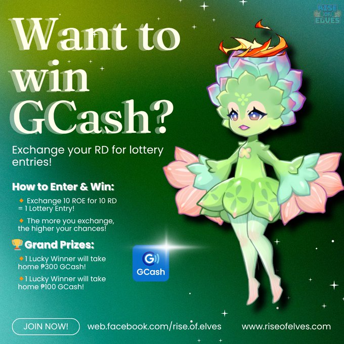 WIN GCASH THIS OCTOBER! โThe Rise of Elves October Adventure has your chance to win cash prizes โHow to get an entry? Simple! Exchange 10 ROE for 10 RD to receive 1 lottery entry. The more you exchange, the higher your chances โRegister here: web.facebook.com/rise.of.elves