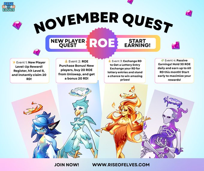 ๐ NEW TO RISE OF ELVES? We're rolling out the red carpet for you! ๐ โโก๏ธ Event 1: New Player Level-Up Reward Simply register and reach Level 8 to snag 20 RD! A perfect kick-start! โโก๏ธ Event 2: ROE Purchase Bonus Buy 20 ROE from Uniswap, hold it, and get another 20 RD! โ#ROE