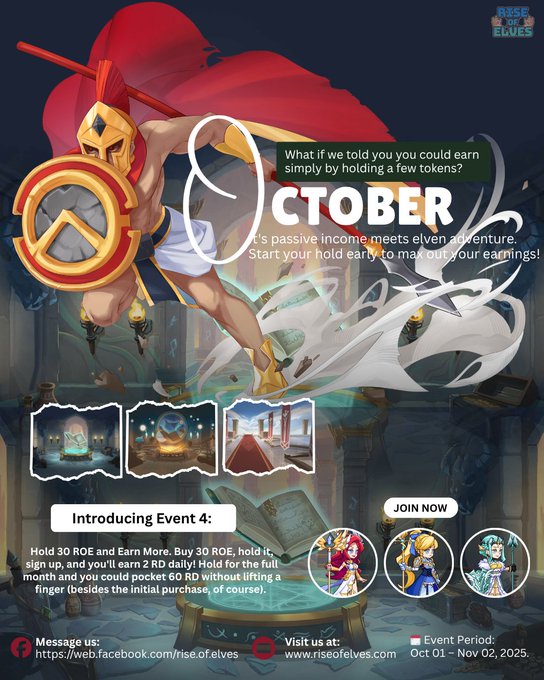 What if we told you you could earn simply by holding a few tokens? The Rise of Elves October Adventure has a 'set it and forget it' event! ๐ง Introducing Event 4: Hold 30 ROE and Earn More. Buy 30 ROE, hold it, sign up, and you'll earn 2 RD daily! Hold for the full month