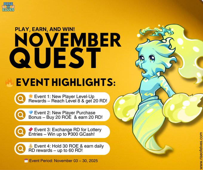 NEW PLAYER QUEST: Level Up & Start EARNING! New to Rise of Elves? November is YOUR month to jump in, earn rewards, and even win GCash prizes! โ๏ธ Event 1: Level-Up Reward ๐ฐ Event 2: ROE Purchase Bonus! ๐ Event 4: Passive Earnings! ๐ REGISTER NOW: facebook.com/rise.of.elves