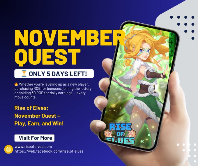โณ Only 5 Days Left! The clock is ticking, Adventurers! Your chance to earn huge RD rewards is almost over. This is your moment to finish strong in the Rise of Elves: November Quest โ Play, Earn, and Win! โก๏ธ Click here to Register Now: web.facebook.com/rise.of.elves #RiseofElves #Nov