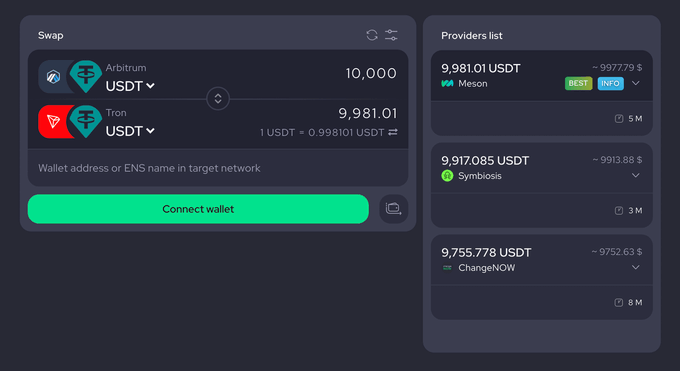 Rubic dropped fees to 0% for stablecoin swaps with @trondao! Bridge USDT & USDC from any network to/from TRON with 0 protocol fees. Choose between top bridges like @Orbiter_Finance, @mesonfi, @symbiosis_fi, @ChangeNOW_io, & @Bridgersxyz - all on Rubic's Best Rate Finder!