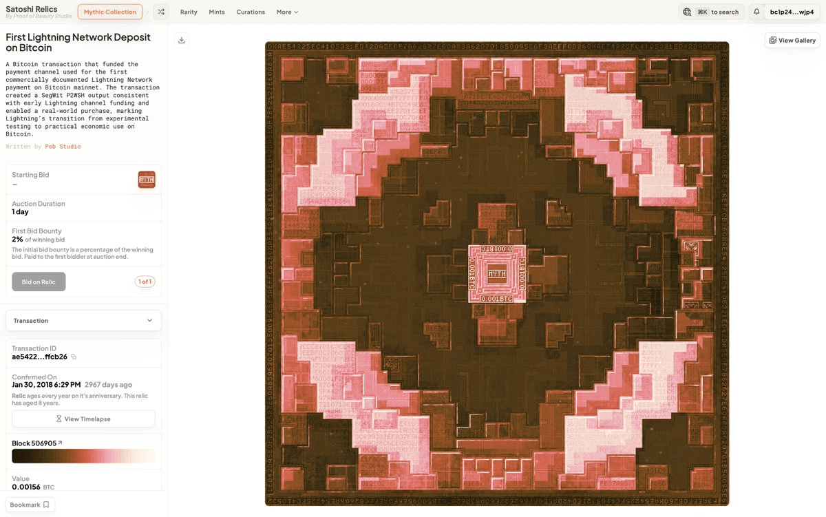 **Satoshi Relics** transforms Bitcoin's transaction history into collectible Ordinals. Each "Relic" is a 1:1 digital artifact generated directly from a real Bitcoin transaction using the recursive endpoint `/r/tx/[txid]`. **How it works:** - Every Bitcoin transaction can become a unique Ordinal artwork - Transaction details deterministically encode into visual art - Priced at 2,500 sats (0.0001 BTC) per Relic - Over 1.3 billion potential transactions available **Notable examples include:** - Genesis block transactions - Early Satoshi Nakamoto transactions - Historic moments like the Constitution inscription - Rare events (only ~350 transactions with fees exceeding coinbase subsidy) The project positions itself as Bitcoin's "history substrate" - preserving ledger records as museum-worthy artifacts. Rather than creating new art, Relics render existing proof-of-work records into "humanly legible" collectibles. View the Value Overflow Fix coinbase transaction Relic at [pob.studio](https://www.pob.studio/tx/0x1f38a30c346679cb508352d134f7897798a0216e57366caac2013139a80df824/details).