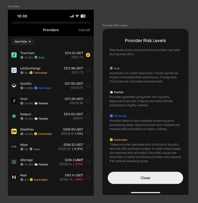Best swap rate is useless if your funds get frozen! Most swap apps show you the best rate. Unstoppable does that and shows you the risk too! For every swap quote you see the provider risk profile because the best rate means nothing if your funds get frozen. Risk labels: AUTO