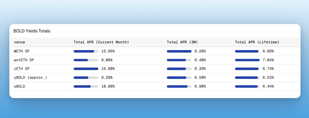 Liquity V2's Stability Pool has achieved **7% lifetime yield** since inception, with recent performance reaching higher returns due to increased liquidation activity. **Key Features:** - Zero leverage or duration risk - No counterparty risk or TradFi dependency - Yield paid in BOLD and ETH - 100% of borrower fees passed to users - 75% of fees directed to Stability Pool depositors **How It Works:** Yield comes from crypto-native sources: DeFi borrowing demand and ETH liquidations during market volatility. This creates returns uncorrelated to traditional treasury yields. Unlike T-bill wrappers or lending markets, BOLD offers predictable returns without token emissions, lockups, or vesting requirements. [Learn more about Stability Pool mechanics](https://www.liquity.org/blog/liquity-v2-bold-stability-pool-opportunities)