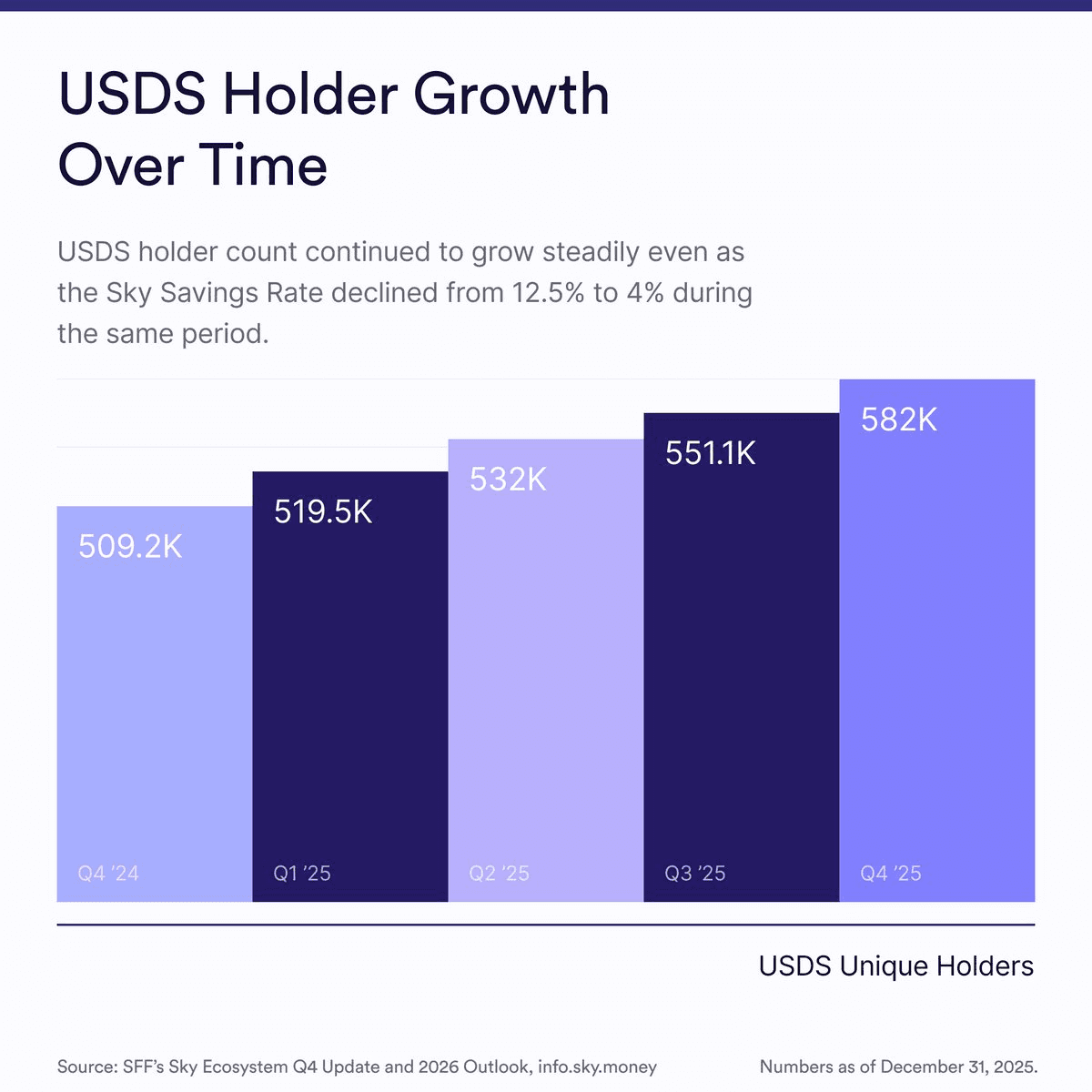 **USDS continues strong growth trajectory despite declining yields** The Sky Protocol's USDS stablecoin saw significant adoption in 2025, with supply increasing from $5.3B to $9.2B - a 73% jump. The number of USDS holders grew from 509,000 to 582,000. This growth occurred even as: - The Sky Savings Rate fell from 12.5% to 4% - Overall DeFi rates declined across the market - USDS supply is currently at $9.4B **Key metric**: USDS supply growth is outpacing the broader stablecoin market, according to SFF's Sky Ecosystem Q4 Update and 2026 Outlook report. The decentralized stablecoin allows users to earn rewards through the Sky Savings Rate system, with deposits accepted from USDS, USDC, or USDT with no minimum requirements.