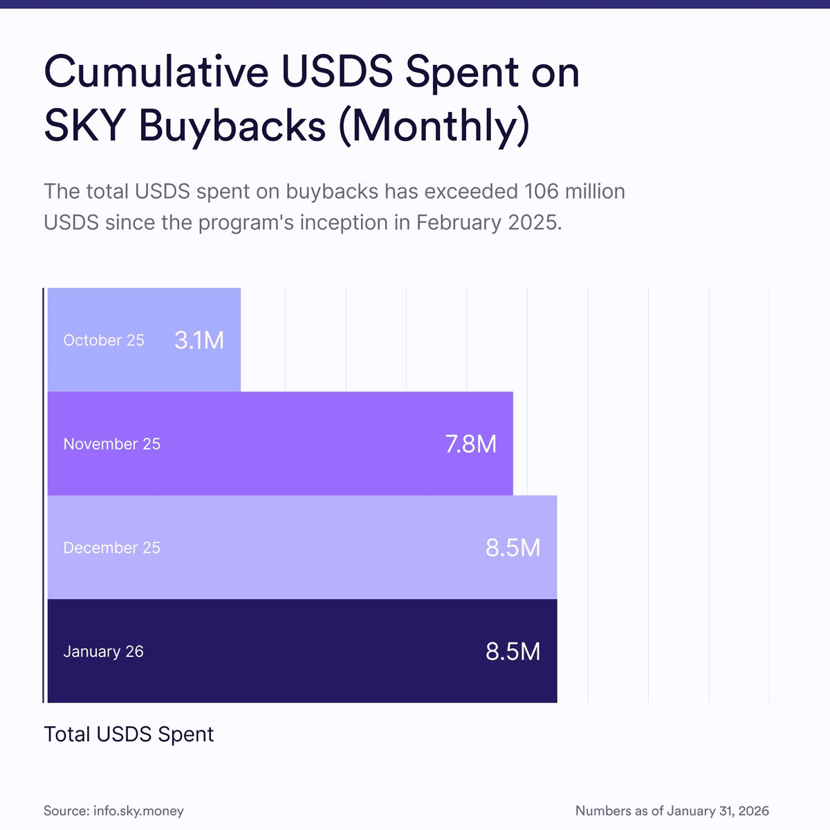 Sky Protocol purchased 130 million SKY tokens in January using 8.5 million USDS. The buyback program has now spent over 106 million USDS total since launching in February 2025. **Key figures:** - January buyback: 130M SKY tokens - Cost: 8.5M USDS - Total program spending: 106M+ USDS The protocol has been consistently buying back tokens, with previous weeks showing purchases of approximately 30M SKY tokens for around 1.9M USDS each week.
