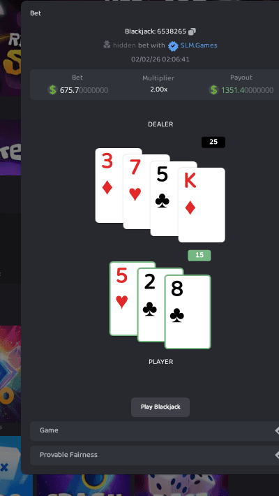 A blackjack player secured a **$1,351 win** on SLM.Games after the dealer busted at 25. **Key Details:** - Initial bet: $675 - Payout: 2x multiplier - Game type: Provably fair blackjack - Verification: Every hand verifiable on-chain The platform offers **transparent, blockchain-verified gameplay** where players can independently verify the fairness of each hand. This win demonstrates the platform's commitment to provable fairness in crypto gaming. Play at [slm.games](http://slm.games)