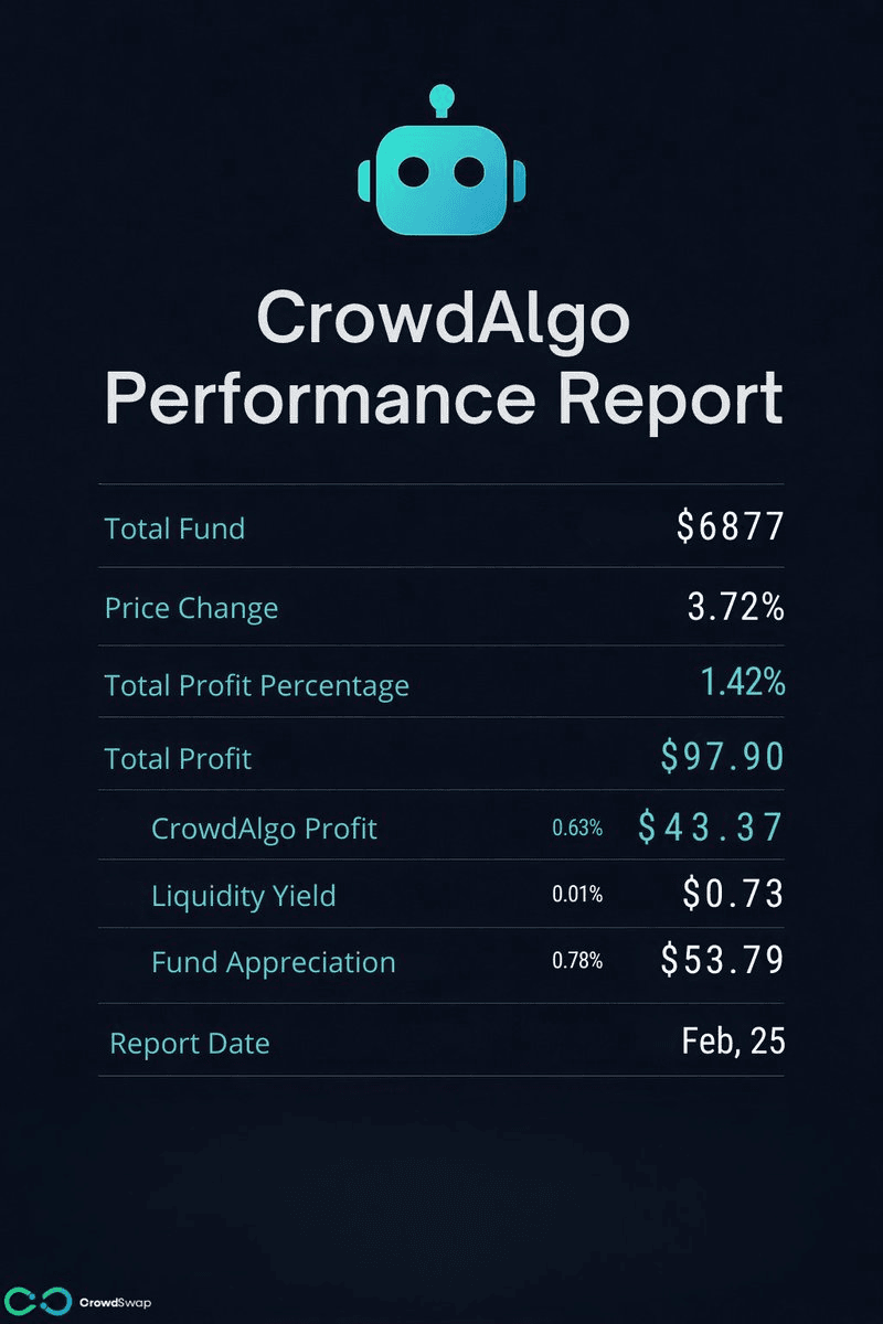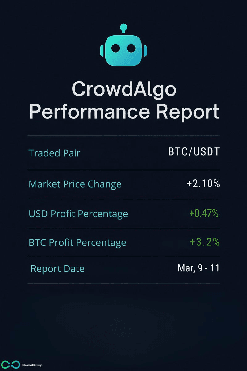 **CrowdAlgo Performance Update** CrowdSwap's automated trading system CrowdAlgo reported performance results for Feb 26, with profits calculated in USD as Bitcoin's price increased. **Key Details:** - The system continues to capitalize on market movements through automated trading - Liquidity yield represents only 0.03% of total profits in the example shown - CrowdSwap takes 30% of liquidity yield under the lifetime offer, with no share of other profits - The lifetime offer ends tomorrow (Feb 28) **How It Works:** CrowdAlgo adapts to different market conditions: - Rising prices: profits from the increase - Ranging markets: profits from fluctuations - Declining prices: accumulates more BTC The system recently expanded to Binance Smart Chain with a BNB/BTC opportunity and includes features like trend detection, token accumulation, and impermanent loss protection. [Learn more about CrowdAlgo](link in bio)