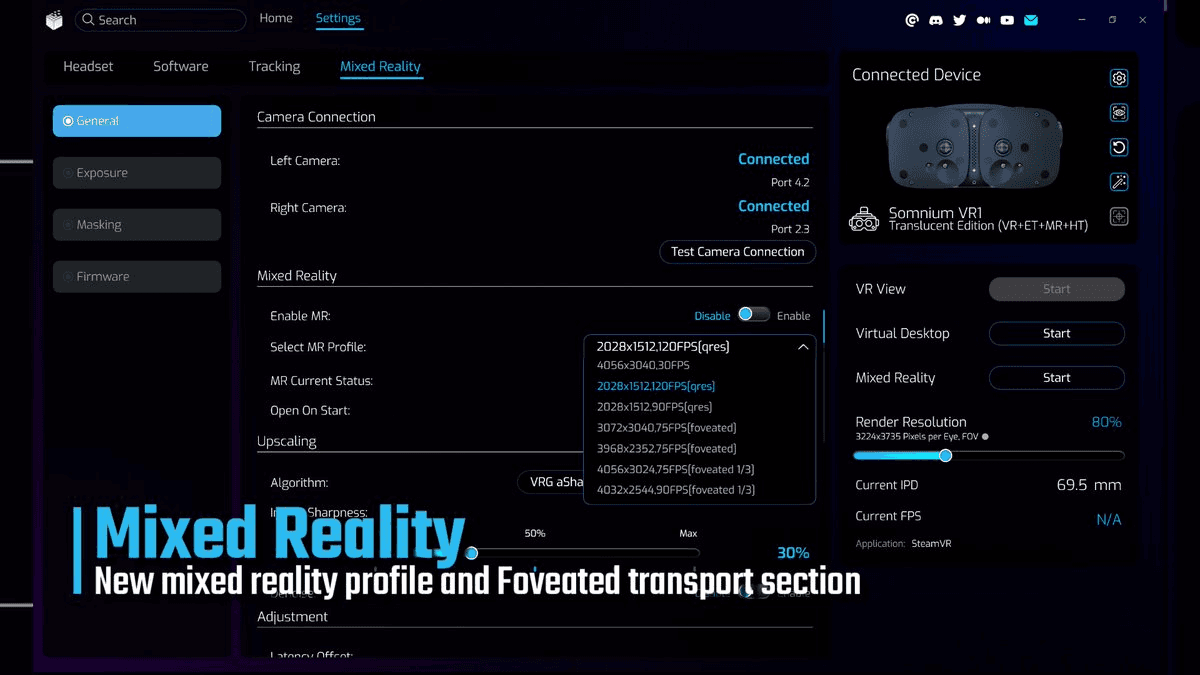 Somnium Space has introduced new mixed reality capabilities focused on performance optimization and visual control. **Key Updates:** - New rendering profile: 40322544 @ 90FPS with 1/3 foveated rendering - Adjustable foveated rendering area for each camera - Enhanced control over mixed reality visual settings These technical improvements build on Somnium Space's existing VR1 headset features, which include edge-to-edge clarity, 135+ degree horizontal field of view, 110-degree vertical field of view, eye tracking, and hand tracking capabilities. The foveated rendering technique reduces computational load by rendering peripheral vision at lower resolution while maintaining high quality in the user's direct line of sight, enabling smoother performance at 90 frames per second. Learn more about [Somnium Space VR1](https://somniumspace.com)