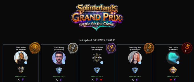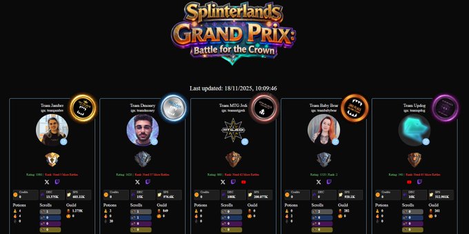 π₯ Splinterlands Grand Prix Update! π₯ Last refresh: 18/11/2025 β and the leaderboard is getting WILD! π Team @JambreHS is still holding the crown with the top rating in the event! Theyβre crushing battles, stacking rewards, and setting the pace for the entire field. If
