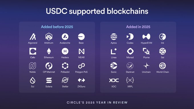 USDC’s multichain expansion accelerated in 2025. → Natively available on 30 blockchains → 14 new networks added in a single year → Built to meet institutional scale and reliability requirements The goal wasn’t just reach. It was usability. CCTP, Gateway, and xReserve work