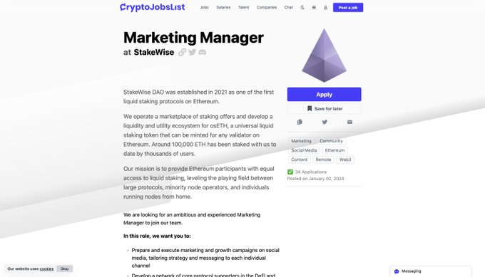 StakeWise Labs is hiring a Marketing Manager 馃ぉ This is your chance to join a growing team of Ethereum's faithful and rise to the top in the hottest industry out there 馃