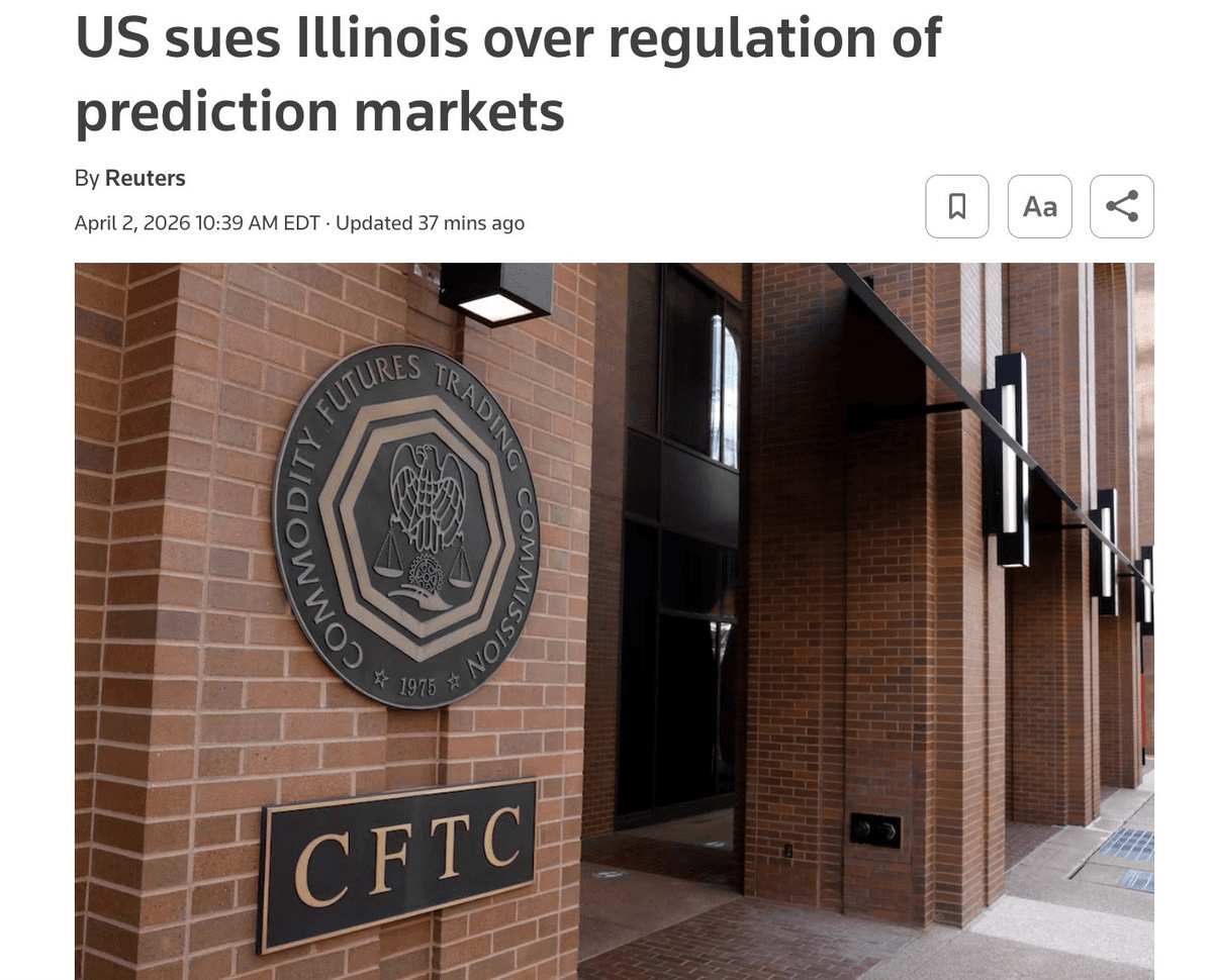 The CFTC and Department of Justice filed a joint lawsuit against Illinois, marking the **first federal action to block state gaming regulators** from overseeing prediction markets. **Key Details:** - Governor J.B. Pritzker and Illinois Attorney General Kwame Raoul named as defendants - Case challenges state authority over prediction market regulation - Could determine whether CFTC or individual states control prediction market oversight **Background:** This lawsuit follows Polymarket's earlier legal challenge questioning whether states have jurisdiction over prediction markets or if federal regulators maintain exclusive control. The outcome may establish a precedent for how prediction markets operate across the United States.