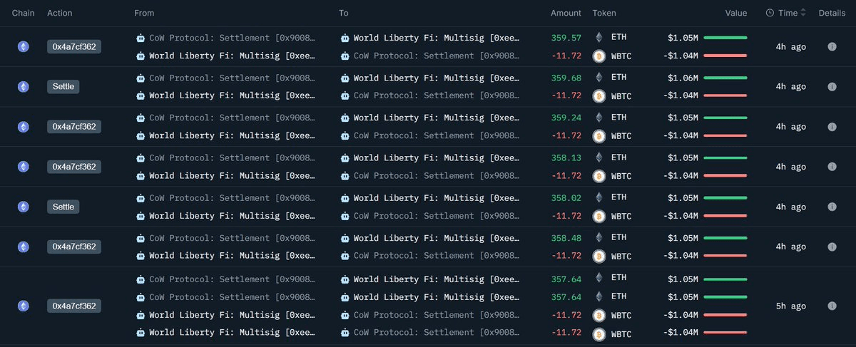 **World Liberty Financial made a significant portfolio shift**, selling 93.77 WBTC (wrapped Bitcoin) valued at $8.1 million to purchase 2,868 ETH at $2,813 per token. **Key Transaction Details:** - Sold: 93.77 WBTC (~$8.1M) - Acquired: 2,868 ETH at $2,813 each - Transaction executed through Trump-backed DeFi platform **Recent Activity Context:** This move follows World Liberty Financial's recent acquisition of multiple ENS domain names (WorldLiberty.eth, trumpcoin.eth, erictrump.eth, barrontrump.eth) and a previous purchase of 14,403 ETH worth approximately $48 million in mid-January. The strategic reallocation from Bitcoin to Ethereum by a Trump-affiliated entity signals potential confidence in ETH's near-term performance. [View transaction details](https://x.com/coinbureau/status/2015639583879565437/photo/1)