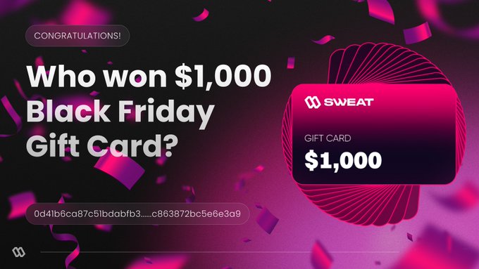 Sweat Economy has revealed the winner of their Black Friday $1,000 Bitrefill gift card giveaway. The winning wallet address is: 0d41b6ca87c51bdabfb3e1a6dea9de03d47c27e4dcb3fd37c863872bc5e6e3a9