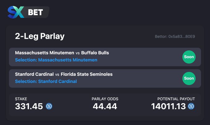 This bettor cooked up a 2 leg CFB underdog parlay that will turn $331 into $14K if these upsets happen. Prediction market leverage, only on SX Bet.