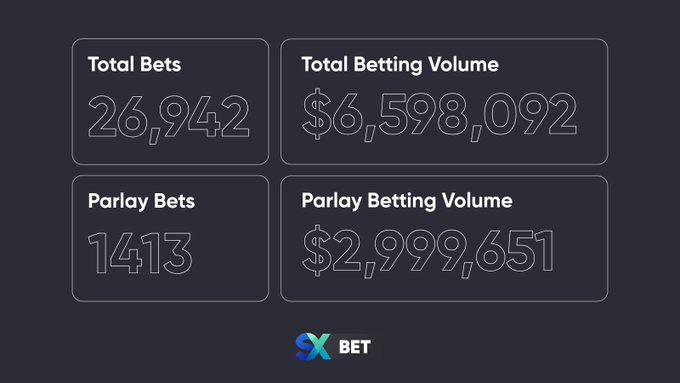 This weeks stats on SX Bet.👇 Close to 27,000 bets and $3M in parlay volume with the tournament kicking off. Prediction market supercycle.