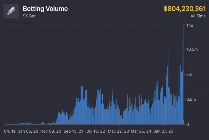 SX has now cleared $0.8 billion in all-time betting volume. The next $0.8B will come much, much faster. Don't believe me? Check the chart.