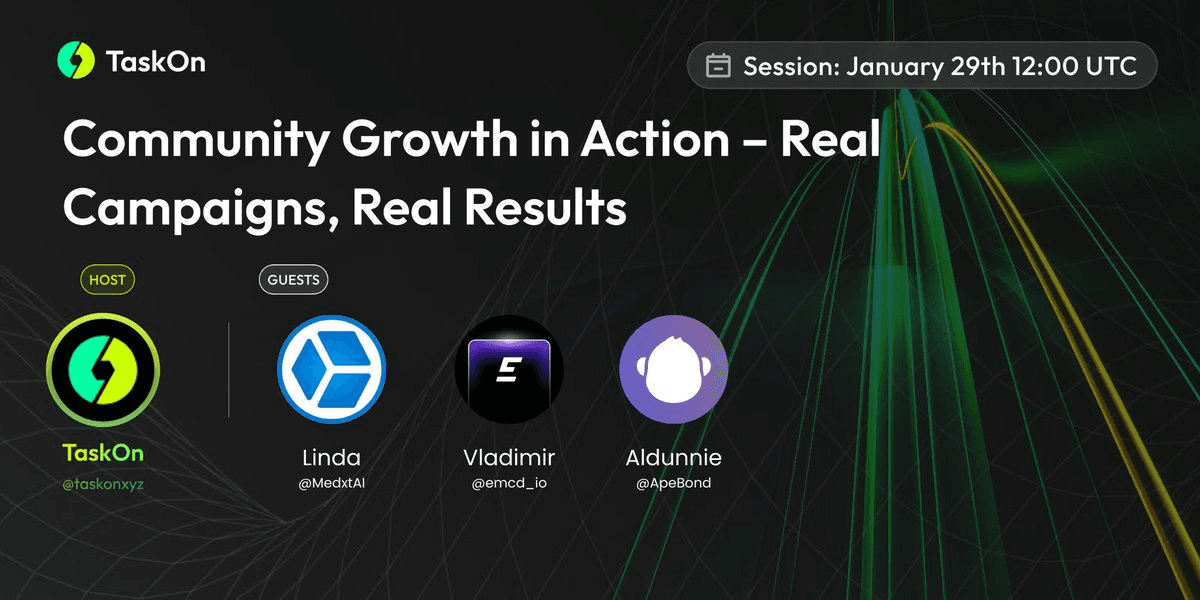 TaskOn organized a live discussion featuring **MedxtAI, EMCD, and ApeBond** to share practical insights on community growth strategies. **Key Details:** - Event held January 29 at 12:00 UTC - Focus on real campaign results and measurable outcomes - Emphasis on actionable tactics over promotional content The session aimed to provide concrete examples of what drives genuine community engagement in Web3 projects. [Join the conversation](https://x.com/i/spaces/1RDGlAlOAqRJL?s=20)