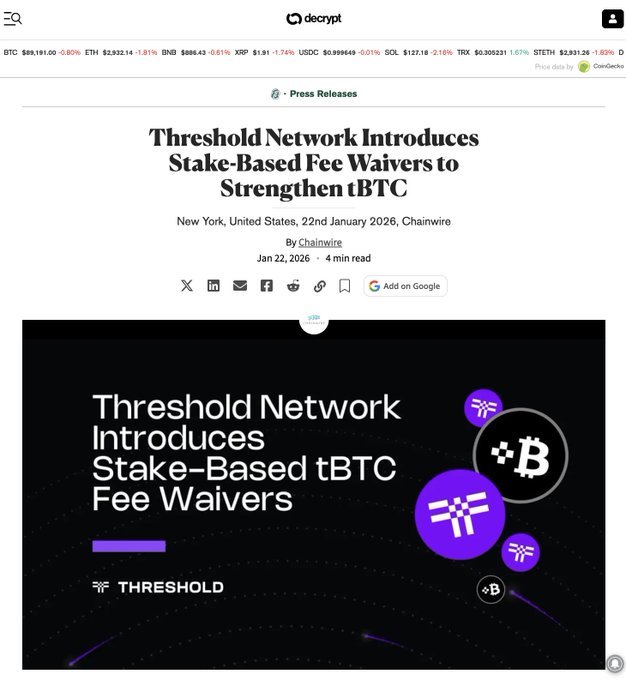 In the news: Yesterday, @DecryptMedia featured Threshold’s introduction of a stake-based fee waiver mechanism, highlighting how the update is designed to strengthen tBTC’s onchain performance by reducing execution friction and supporting tighter pricing across Bitcoin markets.