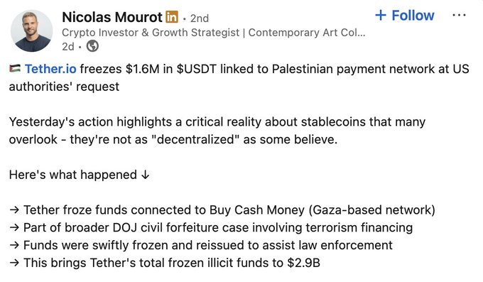 Tether recently froze $1.6M in USDT at the request of U.S. authorities. A stark reminder that all major stablecoins are highly centralized, making them vulnerable to censorship and transaction reversals. And with the treasury-backing requirement in the U.S., they鈥檙e becoming