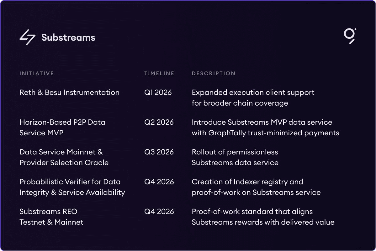 Sequential blockchain indexing struggles at scale. **Substreams addresses this challenge** through parallel processing, composable modules, and sub-second latency across chains including Solana, Base, and BSC. **Key technical advances:** - Parallel processing architecture replaces sequential indexing bottlenecks - Sub-second data latency for real-time applications - Support for high-throughput chains (Solana, Base, BSC) **2026 Network Evolution:** Substreams transitions The Graph Network into a fully permissionless data service with: - Trust-minimized payment systems - Provider Selection Oracle for routing - Probabilistic verifier ensuring data integrity The infrastructure targets traditional financial institutions requiring compliance-ready, high-throughput blockchain data access. The parallel processing approach has demonstrated 70% cost reductions and significantly faster historical data backfills compared to sequential methods. [Learn more about Substreams modules](https://substreams.dev/)