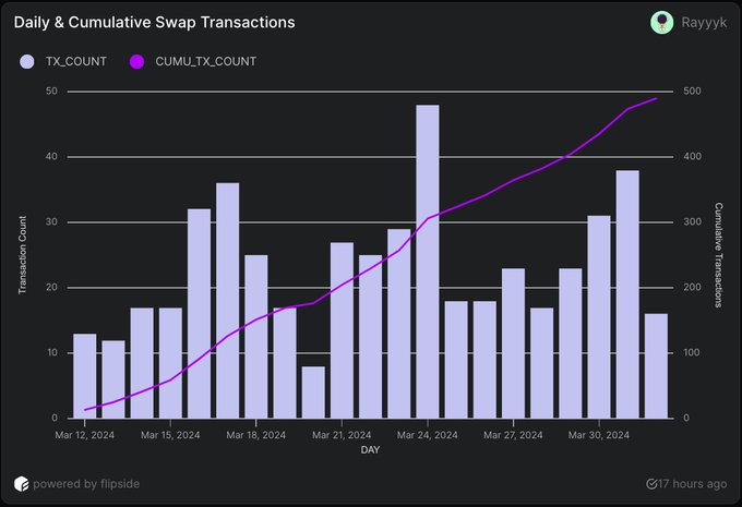 The integration of @THORChain into @lifiprotocol has experienced a consistent increase in swap activity, with close to 500 swaps conducted. A peak of 48 swaps occurred on 24th March 2024, marking it the highest number of swap transactions.