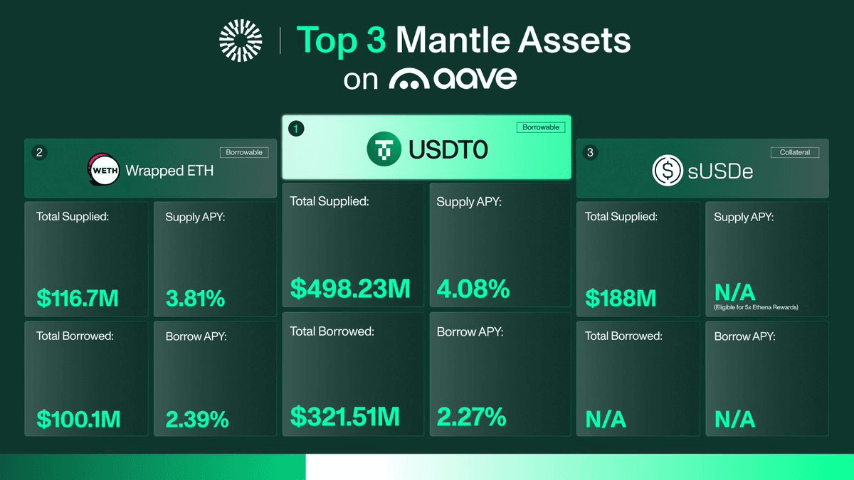 **Major Milestone on Mantle Network** USDT0 has emerged as the leading asset on Aave's Mantle deployment, commanding **$500 million in supplied liquidity**. This represents a significant portion of Mantle's total value locked. **Key Highlights:** - USDT0 holds the #1 position among all assets on Aave's Mantle integration - The $500M supply demonstrates strong institutional and retail confidence - Mantle's TVL recently crossed the $1 billion threshold, with Aave as the primary driver This development underscores the growing adoption of Mantle as a scaling solution and Aave's continued dominance in decentralized lending markets. The concentration of liquidity in USDT0 suggests users are prioritizing stablecoin yields on the network.