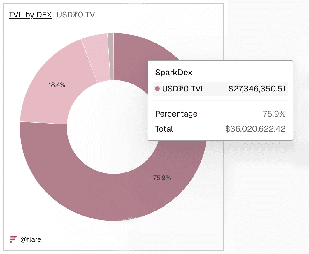 **Major liquidity concentration on Flare Network** Over $27 million in USDT0 is now actively trading on [SparkDex](https://twitter.com/SparkDexAI), representing a significant 75.9% of the total USDT0 supply on [Flare Networks](https://twitter.com/FlareNetworks). **Key context:** - USDT0 launched on Flare Networks in May 2025 with 1:1 Stargate transfers - Multiple DeFi integrations available including liquidity pools, lending markets, and farming opportunities - Users can migrate existing USDT deployments to the new USDT0 standard This concentration of supply suggests strong adoption of SparkDex as the primary trading venue for USDT0 on the Flare ecosystem.