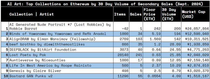 Here鈥檚 the Top 10 in AI Art for September 2024: AI Nude Portrait Number 7 @videodrome WoY @refikanadol AlignDRAW @elmanmansimov beef brothko by @toadswiback DEEPBLACK Lost Poets @muratpak Auntieverse @niceaunties LIWA @rainisto Genesis @ClaireSilver12 B-GAN Punks @bganpunks