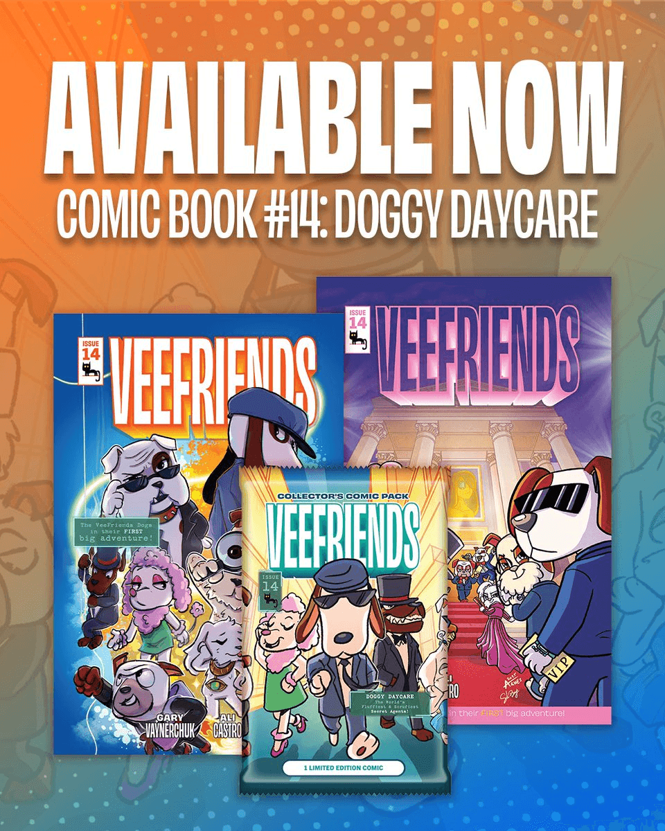 **VeeFriends Comic Book #14: Doggy Daycare** is now available, featuring seven VeeFriends dogs in a spy-action comedy about secret agents operating from a high-end daycare. **Key Details:** - Written and illustrated by Ali Castro (her first published comic book) - Features **8 first comic appearances** including Bad-Ass Bulldog, Dialed In Dog, and Polished Poodle - 10,000 total copies in sealed Comic Collector Packs with rare variant chase editions - Two cover variants: Cover A by Ali Castro, Cover B by Agnes Garbowska **Story Overview:** The dogs execute a heist to recover a legendary artifact, but discover the mission was about surveillance and control. The narrative explores themes of intuition versus obedience, and what happens when loyalty is exploited. **Availability:** - Public sale launched March 27th at $24.99 - Available at [shop.veefriends.com](https://shop.veefriends.com/collections/comic-books) - Live Whatnot drop hosted by Gary Vaynerchuk This marks VeeFriends' continued expansion of ensemble character teams within their 250+ character universe, following Comic Book #13: Farm Fights.