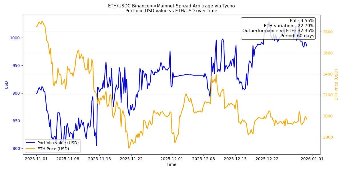 A trading bot called Stabiliser completed a 60-day live test on Ethereum mainnet, trading the ETH/USDC pair with notable results: **Performance Metrics:** - **+9.55% profit** in USD terms (after gas costs) - **32% outperformance** vs. simply holding ETH - Executed during a period when ETH declined 22% **Trading Activity:** - ~1,500 trades executed - Selected from 18,000 identified opportunities - Ran on mainnet before public release The bot demonstrated its ability to generate positive returns in a declining market by actively managing positions rather than holding static assets. The strategy's selectivity—executing only 8% of identified opportunities—suggests a disciplined approach to trade execution.