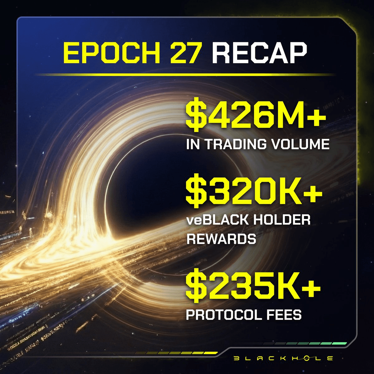 **Epoch 28 Distribution Complete** veBLACK holders received $275,000 in rewards for epoch 28, with earnings automatically distributed to wallets just for holding and voting. **Season 8 Now Active** - Live until February 19th with 7M veBLACK in rewards - Requires supermassive locks worth 2,000+ veBLACK - Season 7 participants already received their 8M veBLACK distribution **Key Metrics** - Over 21.5M $BLACK burned in Season 7 - Current effective rebate rate: 34% - Protocol generated $2.05M+ in fees over last 8 epochs - Average weekly fees: $256.1K *All protocol revenue flows directly to veBLACK holders weekly through voting rewards and fee distribution.*