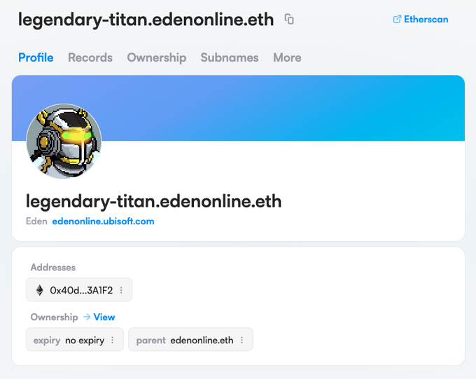 Warriors, Each ID Card comes with its own unique name, like "Legendary Titan". But here’s the magic: you also have an @ensdomains -powered subname! By adding a dash (-) between the words, your unique NFT name transforms into an ENS address: legendary-titan.edenonline.eth