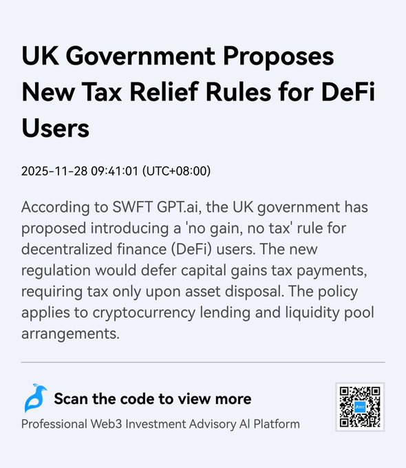 UK eyes a new no gain, no tax rule for #DeFi, pushing capital gains tax to the moment you actually part with your crypto. Lending and liquidity pools just got a plot twist 馃摐馃挕鈿★笍馃殌