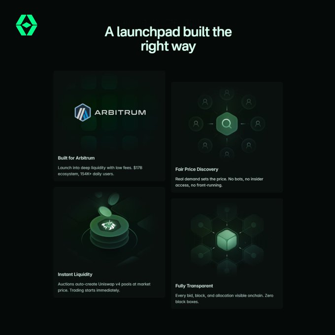 Continuous Clearing Auctions are now live on @arbitrum With this deployment, Arbitrum builders can now: β Run onchain token auctions β Discover a credible market price β Automatically seed liquidity on v4 In a way that's transparent and open to everyone