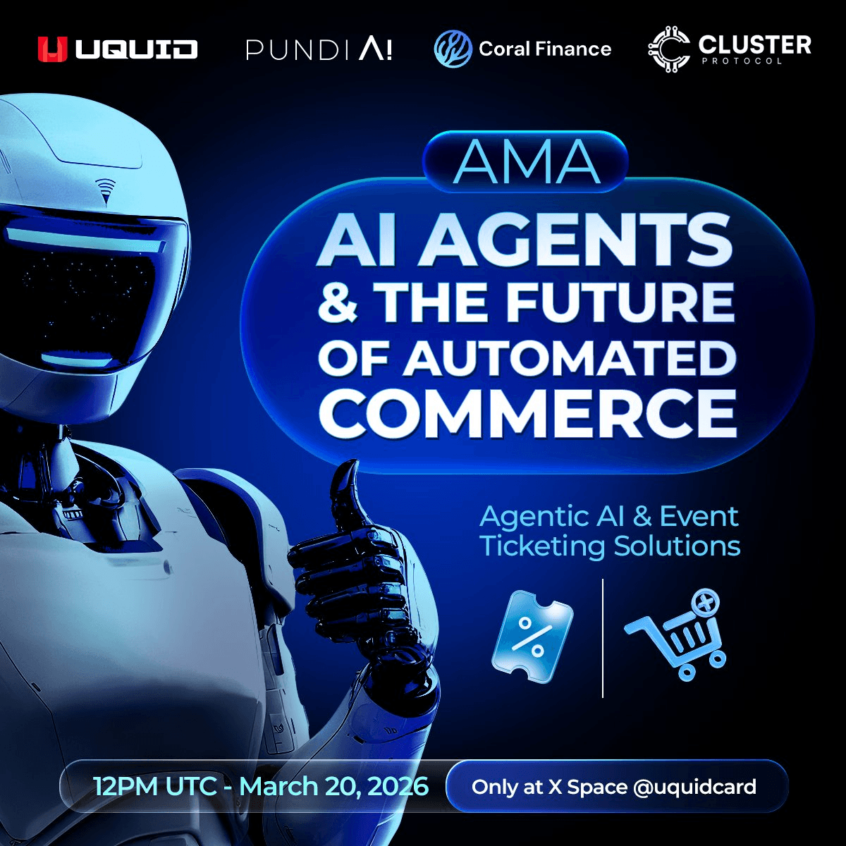 An AMA session is scheduled for March 20, 2026 at 12:00 PM UTC focusing on AI agents and automated commerce. **Participants:** - PundiAI - Coral Finance - Cluster Protocol **Topics to be covered:** - Agentic AI applications - Event ticketing solutions - Future of automated commerce This follows a previous AMA in February 2026 that explored AI's role in crypto shopping, which featured a 100 USDT prize pool for top questions.